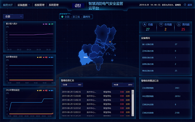 智慧消防電氣安全監(jiān)管云平臺是一個面向消防電氣物聯(lián)網(wǎng)的大數(shù)據(jù)處理平臺,涵蓋了數(shù)據(jù)接入、計算、存儲、交換和管理。該平臺支持多個主流物聯(lián)網(wǎng)通訊協(xié)議,用戶可以便捷地接入前端多種類型的感知設(shè)備,能夠跨網(wǎng)絡(luò)進行多層級的設(shè)備接入和管理,并且為用戶提供授權(quán)認(rèn)證、實時監(jiān)測、數(shù)據(jù)分析、監(jiān)測報警等云服務(wù)功能。